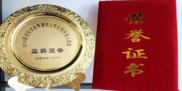 2015年2月,藍(lán)英裝備(股票代碼:300293)參加由中國上市公司協(xié)會(huì)、中國證券投資者保護(hù)基金公司主辦,中國證券業(yè)協(xié)會(huì)、中國證券投資基金業(yè)協(xié)會(huì)協(xié)辦的2014年度最受投資者尊重的上市公司評(píng)選活動(dòng),最終藍(lán)英裝備獲得2014年度最受投資者尊重的上市公司評(píng)選入圍獎(jiǎng)。