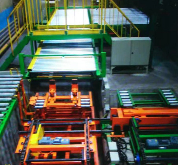 從擠出機(jī)排出的合格胎面通過定中及輸送輥床、單條胎面橫向定位組合傳送帶、多條胎面導(dǎo)出輸送帶、活動導(dǎo)入指型輸送輥道、液壓升降平臺,將胎面裝入格柵車。以備轉(zhuǎn)入成型機(jī)工序。