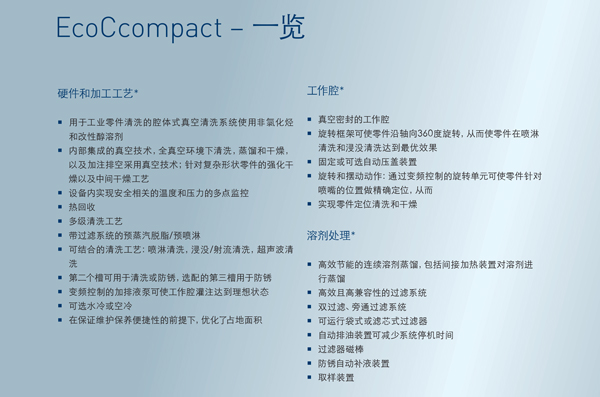 EcoCCompact可適用于相當(dāng)廣泛的應(yīng)用領(lǐng)域,從快速脫脂到需要依照嚴(yán)格清潔度參數(shù)規(guī)格的高要求清洗。
